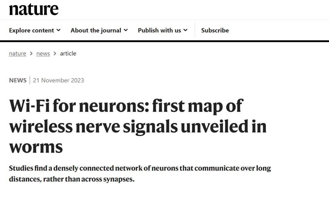 In an article published about one and a half months ago in the journal Nature, for the first time, a reference has been made to a Wi-Fi nervous system, which has been discussed for several decades in both theoretical and practical lessons of Faradarmani, a subset of the school of Erfan Keyhani Halgheh. Known as the “Secondary Nervous System, or Neural Bluetooth System, or Neural Wi-Fi System, etc.,” in the school of Erfan Keyhani Halgheh, this concept was introduced to esteemed researchers in the first phase, utilized experimentally, and then explored in various theoretical and practical ways, including “T-Consciousness charging, T-Consciousness transfer, etc.” It is important to note that apart from the aforementioned aspects, T-Consciousness transfer also involves the transmission of mutations from one species to others during pandemics, for instance, from mutated viruses in one region to other parts of the Earth, which has been frequently discussed and extensively mentioned in announcements. The research presented in the scientific journal Nature is a validation of the second part of T-Consciousness transfer and the Wi-Fi nervous system, dedicated to scientists and researchers worldwide (for informational purposes only).